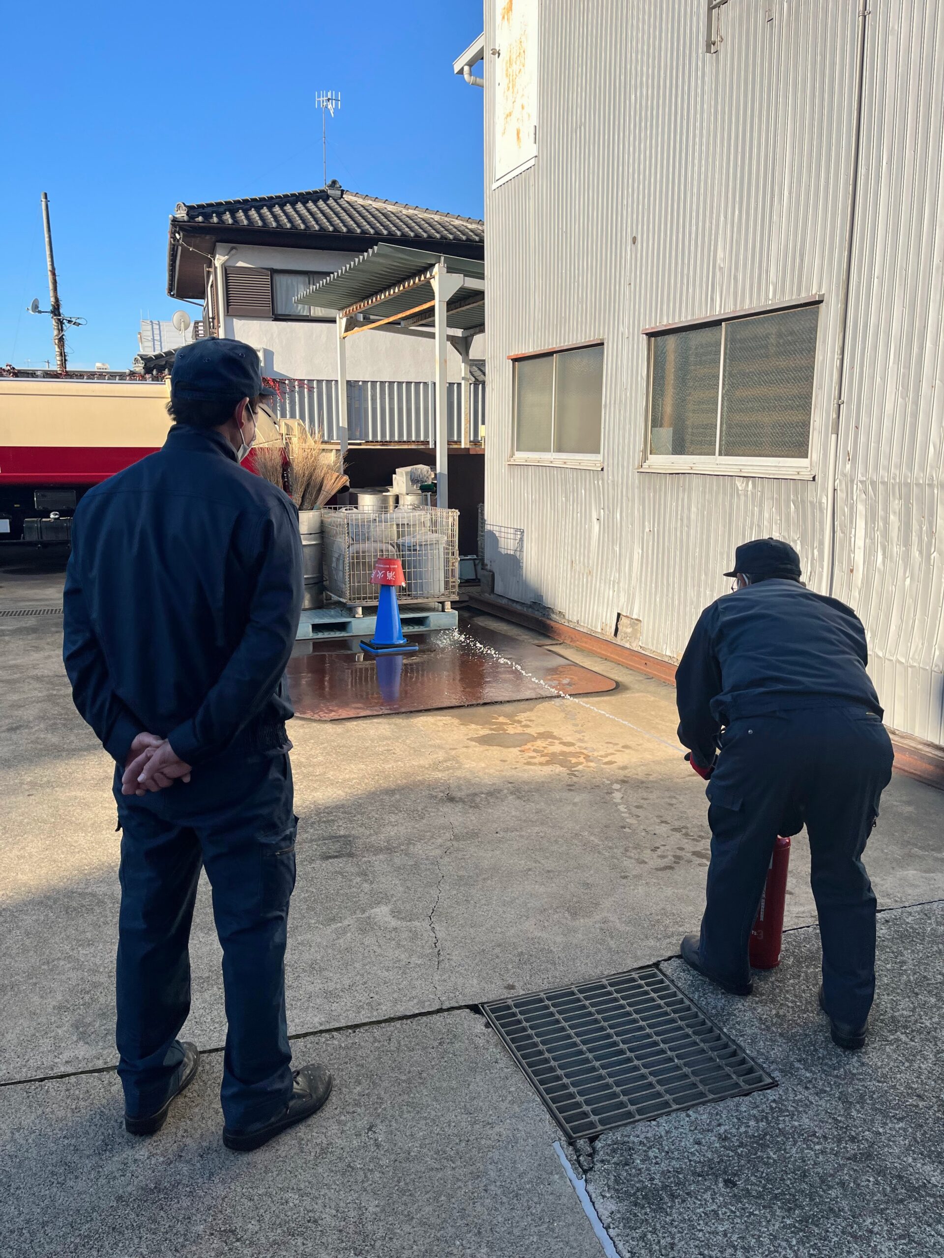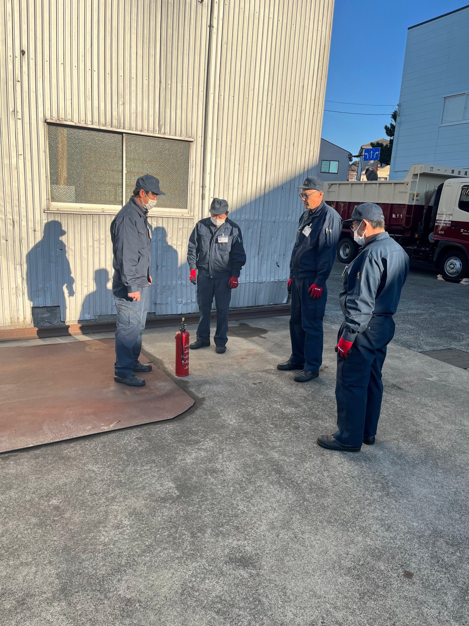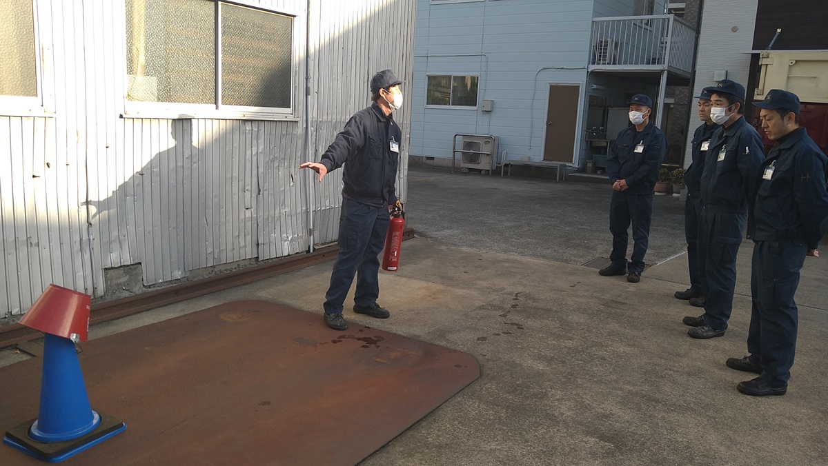 また、地震による2次災害で火災が発生する可能性もあるので本社の消火器の保管場所や消火器の使用方法を教育しました。