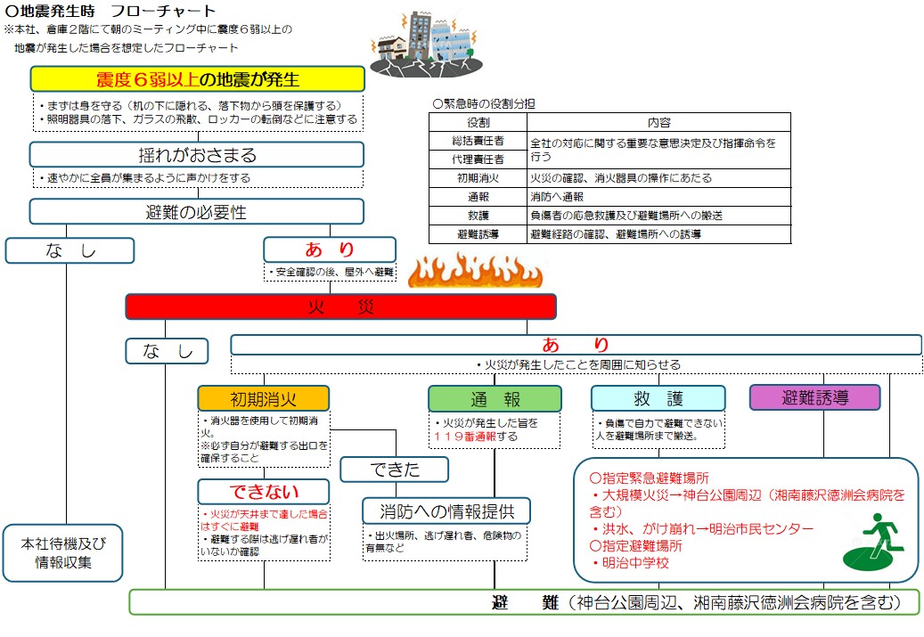 当社でも震災時の初動がスムーズに行くよう地震災害時のフローチャートを作成し